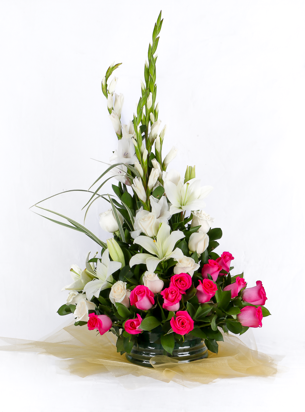 18 ROSAS COMBINADAS EN DOS COLORES, LIRIOS Y GLADIOLOS BLANCOS CON CINTILLAS EN BASE DE VIDRIO