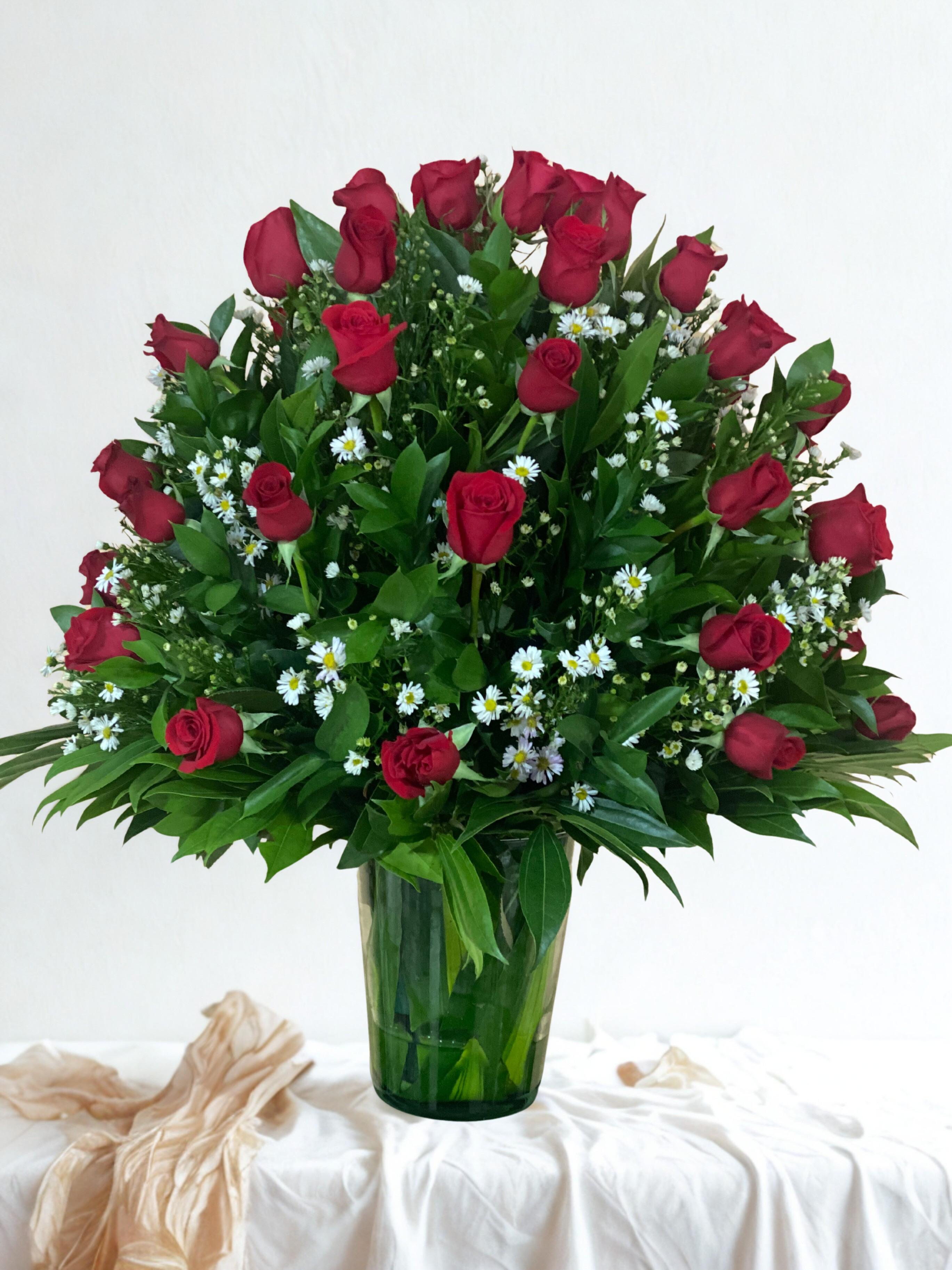 48 ROSAS EN JARRÓN DE VIDRIO CON CINTA EN TELA (No incluye Chocolates - Vino o peluche; estos los puedes adquirir en nuestra categoría COMPLEMENTOS ó encuéntralos más abajo)