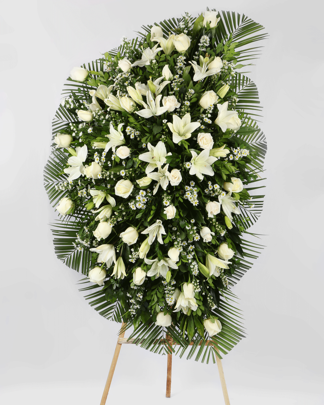 PEDESTAL MEDIA LUNA EN ROSAS BLANCAS, PALMA REVELIN, BOCAS DE DRAGON. INCLUYE ATRIL Y CINTA
