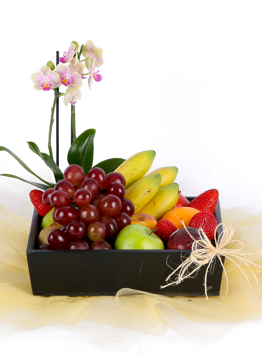 CAJA DE FRUTAS, ACOMPAÑADAS DE UNA PEQUEÑA PLANTA DE ORQUÍDEA, ELABORADA EN BASE DE MADERA