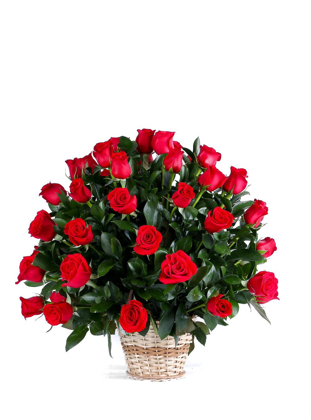 48 ROSAS ROJA ACOMPAÑADAS CON RUSCUS EN CANASTO DE MIMBRE