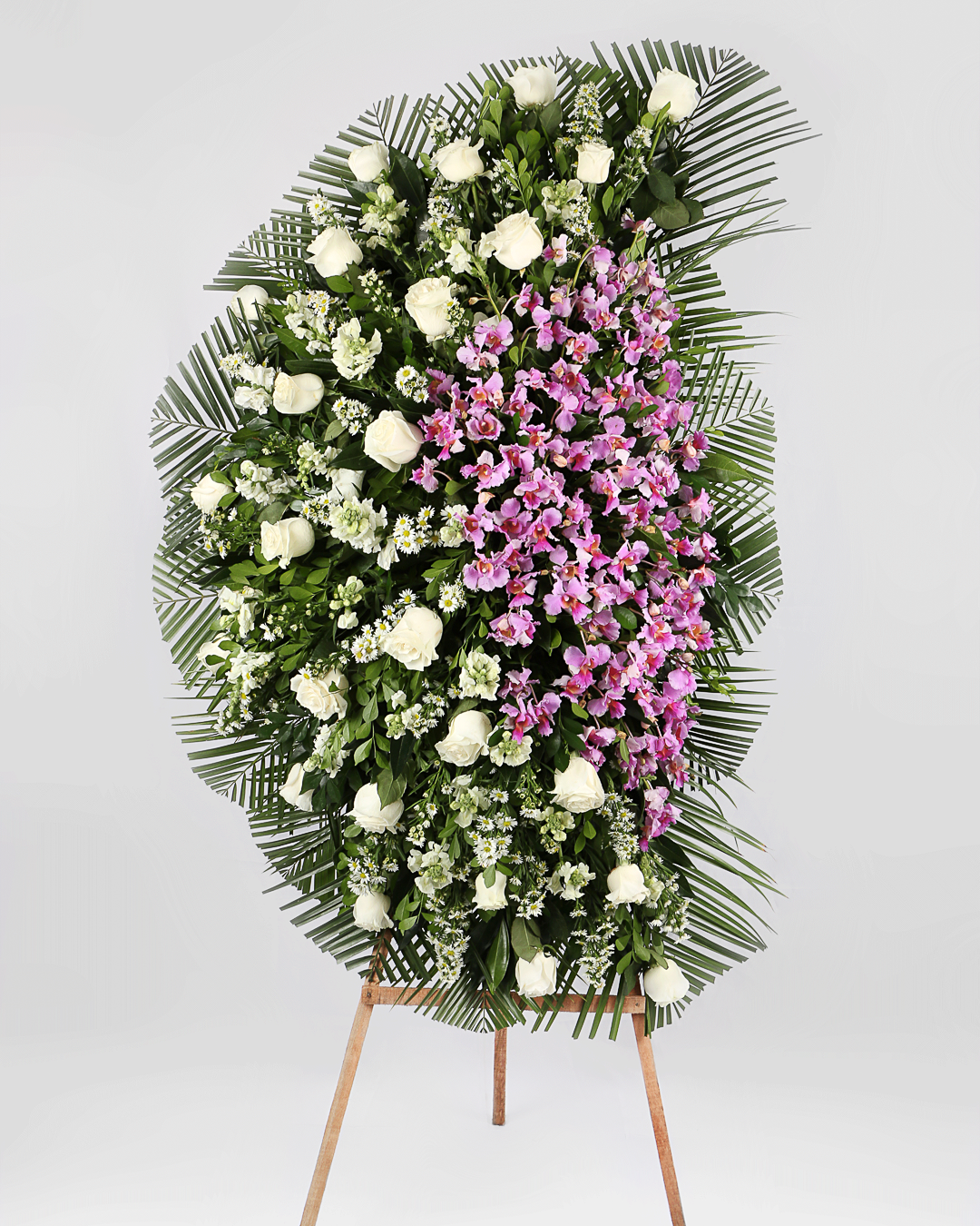 PEDESTAL MEDIA LUNA CON 30 ROSAS BLANCAS, ORQUÍDEAS HAWAIANAS, PALMA REVELIN. INCLUYE ATRIL Y CINTA