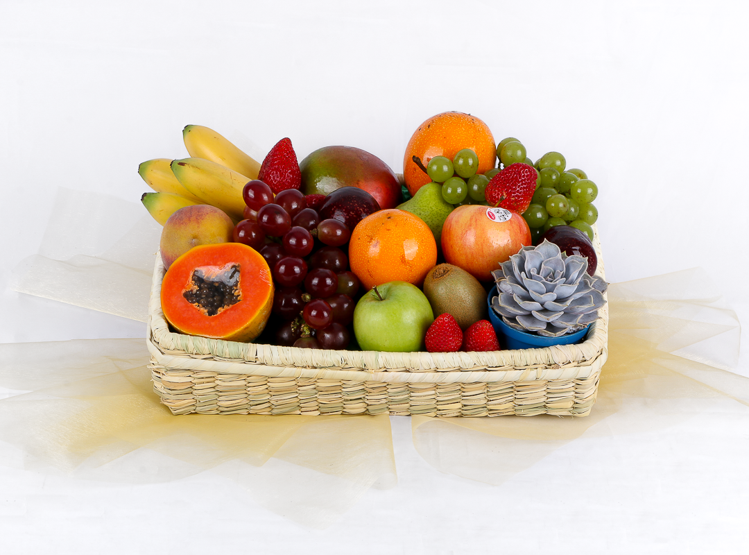 CANASTA ARTESANAL CON FRUTAS FRESCAS, ACOMPAÑADA DE UNA PEQUEÑA PLANTA SUCULENTA.