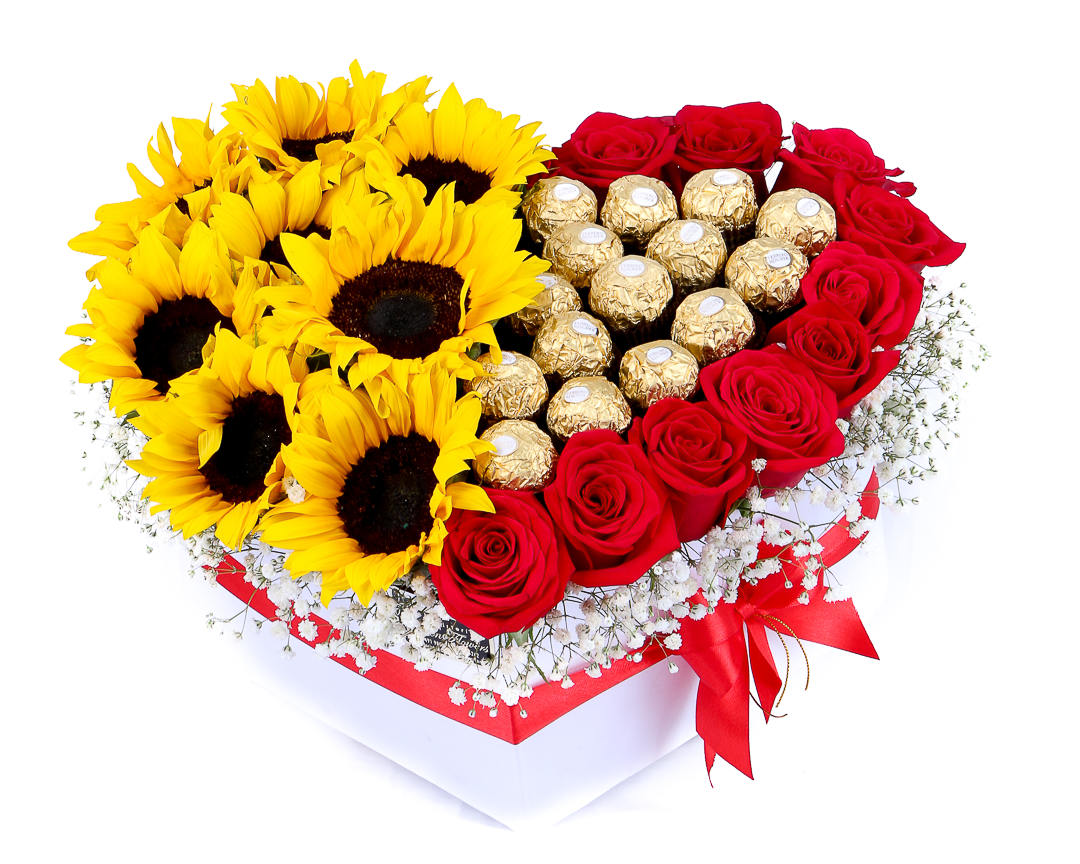 GIRASOLES EN CAJA CON FORMA DE CORAZON, 10 ROSAS Y 15 CHOCOLATES FERRERO CON MOÑO EN SATIN.