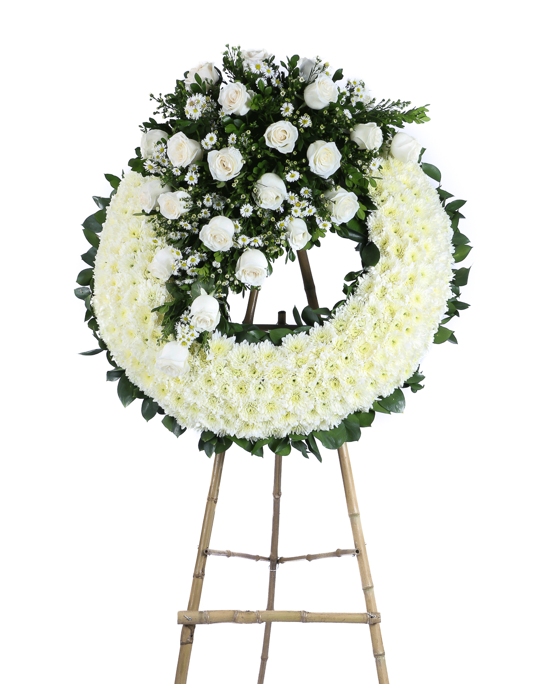 CORONA ELABORADA EN ROSAS, POMPON Y RUSCUS (INCLUYE CINTA Y ATRIL)