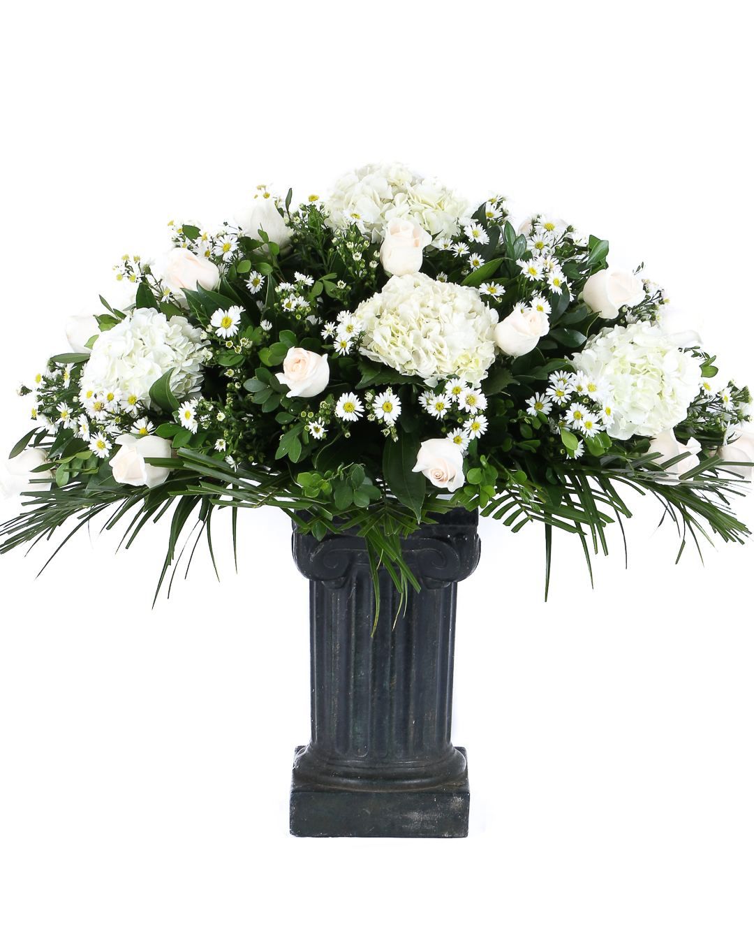 RAMO PARA FUNERAL EN ROSAS BLANCAS Y HORTENSIAS BLANCAS EN BASE DE ICOPOR. INCLUYE TARJETA