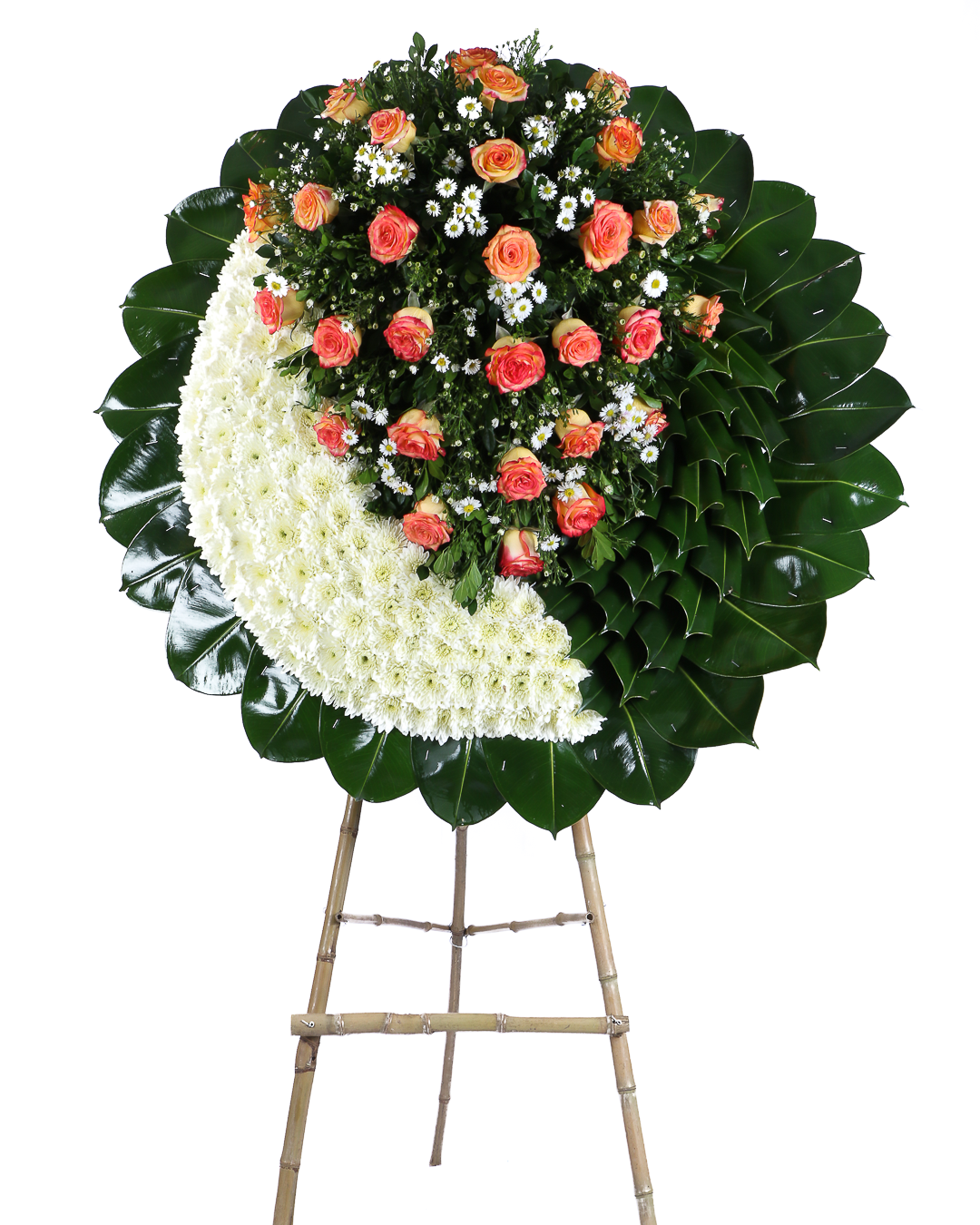 CORONA ELABORADA EN ROSAS, POMPON Y HOJAS TEJIDAS (INCLUYE CINTA Y ATRIL)