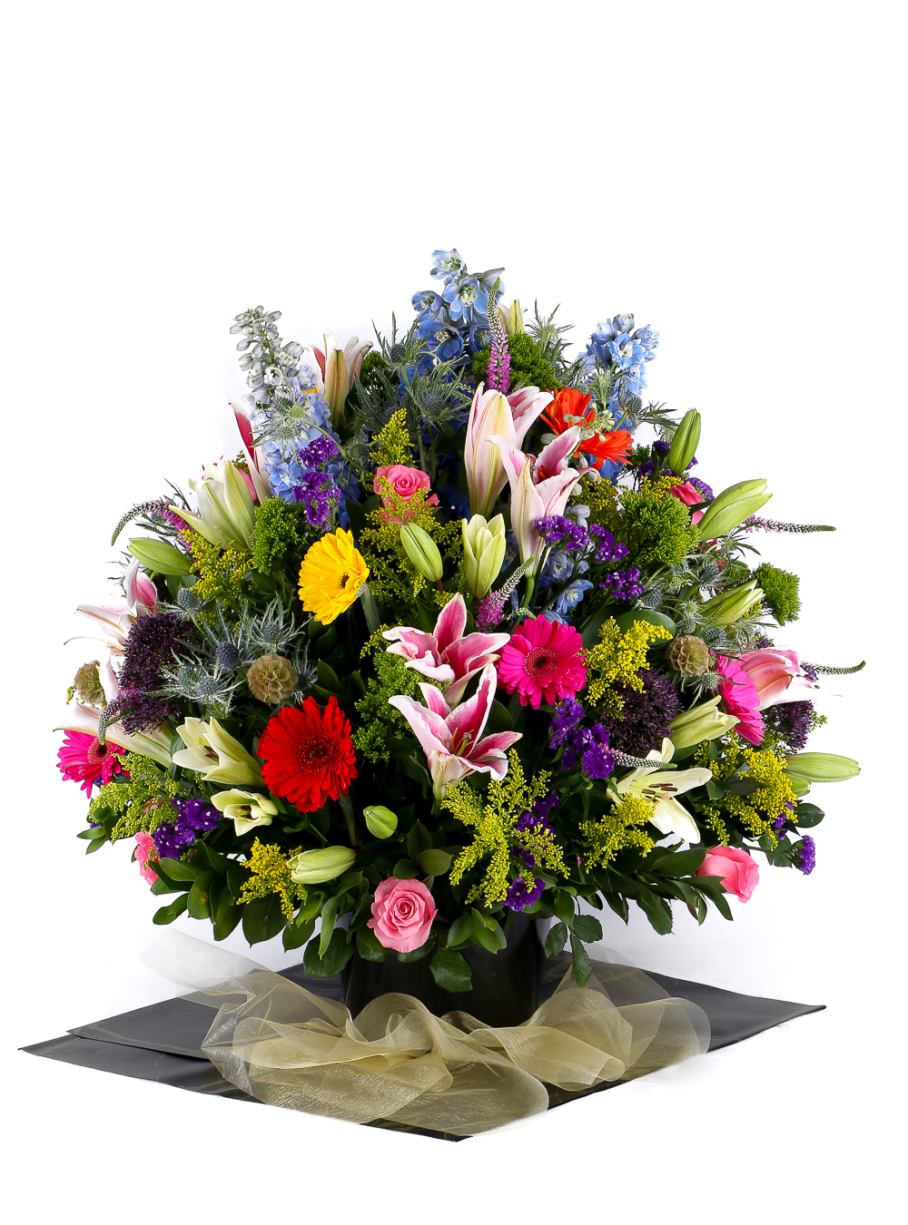 ARREGLO TROPICAL ELABORADO EN LIRIOS DE COLORES, GERBERAS, BELLADONAS, ROSAS SURTIDAS, SOLIASTER, RUSCUS Y STATICE