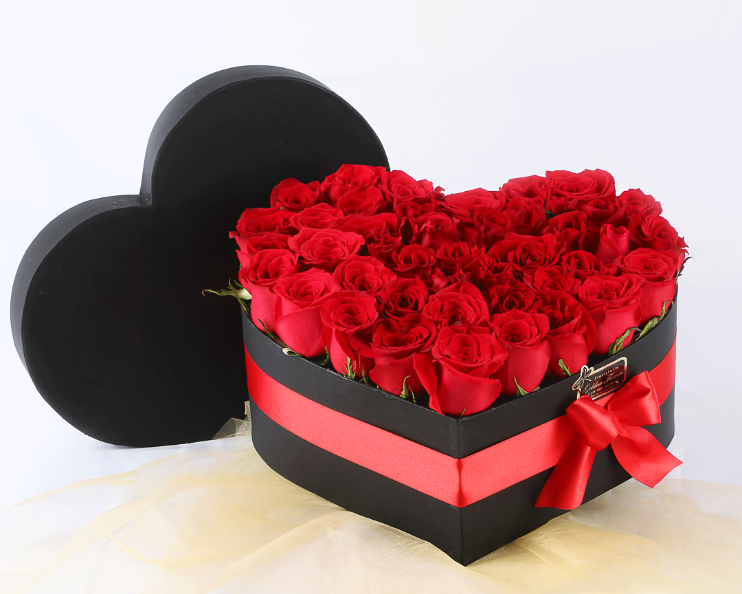 48 Rosas en caja negra o blanca, en forma de corazón con cinta en tela