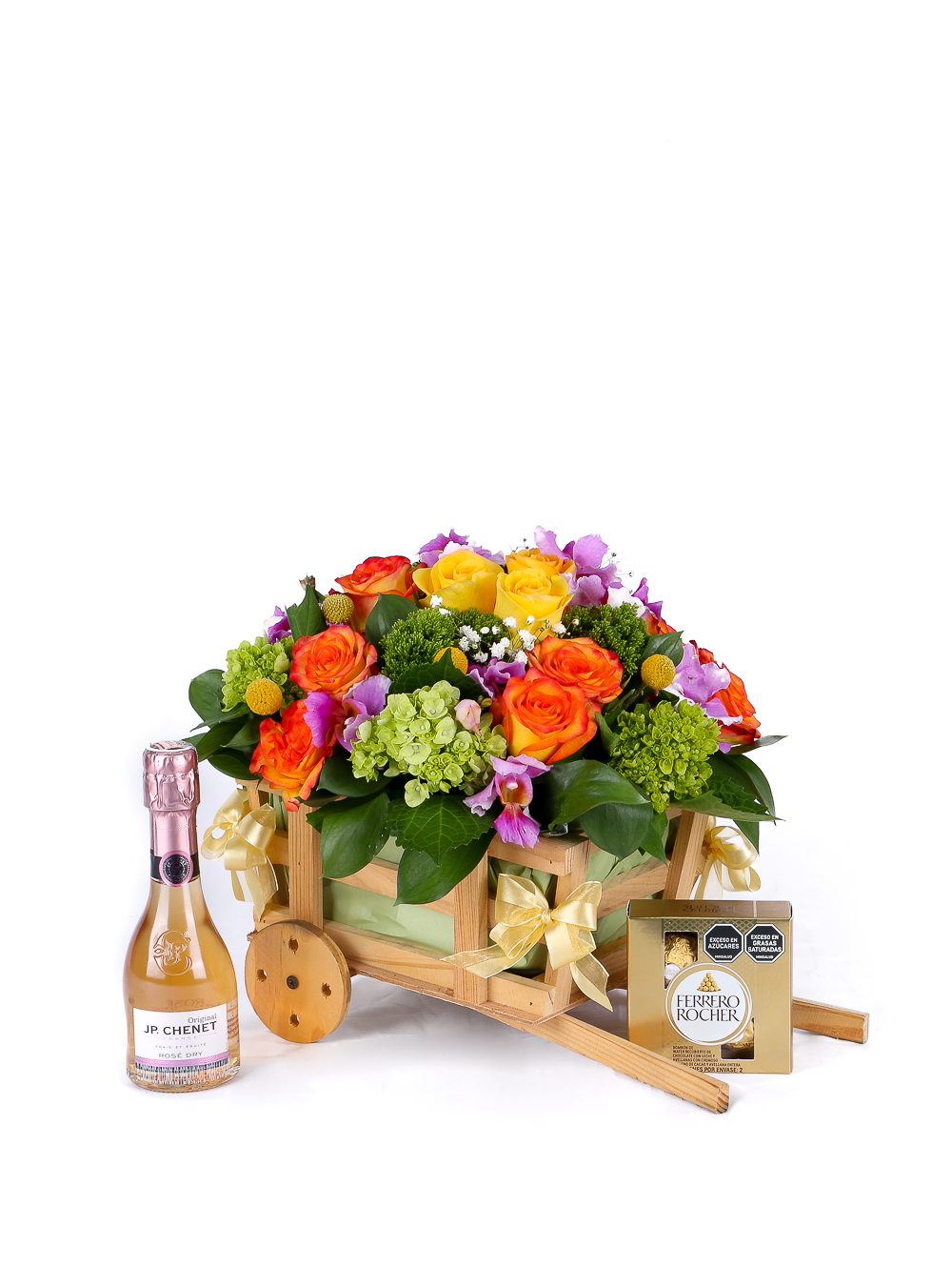 CARRETA EN MADERA ELABORADA EN ROSAS DE COLORES, HORTENSIAS, ORQUIDEA HAWAYANA Y GIPSOPHYLA.