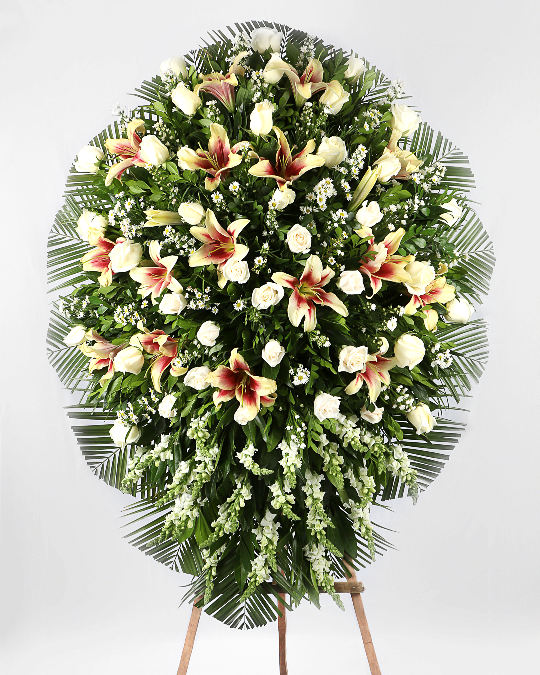 PEDESTAL CON 24 ROSAS BLANCAS, 18 LIRIOS, PALMA REVELIN. INCLUYE ATRIL Y CINTA.